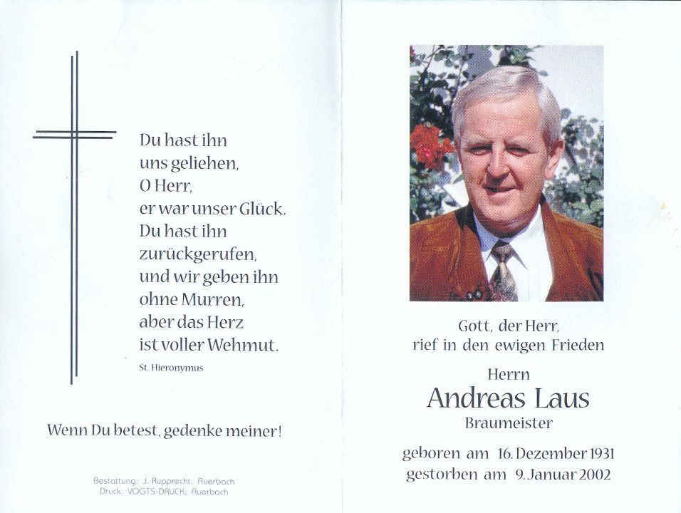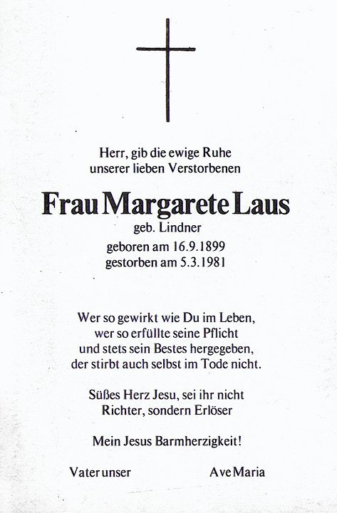 Laus Andreas 16.12.1931-09.01.2002 Laus Georg 06.01.1869-28.06.1933 Laus Georg 30.12.1920-31.07.1944 Laus Margarete geb Lindner 16.09.1899-05.03.1981