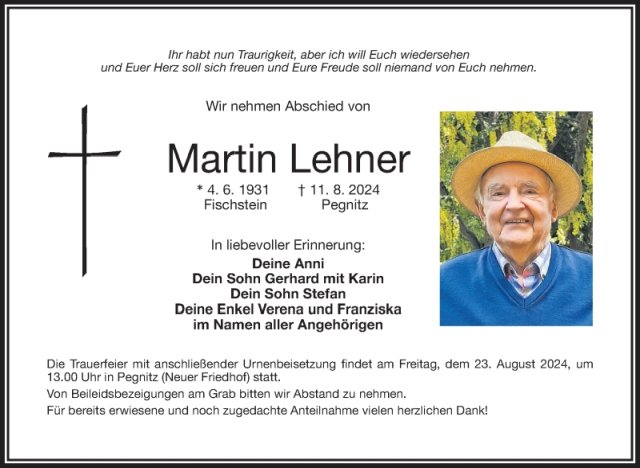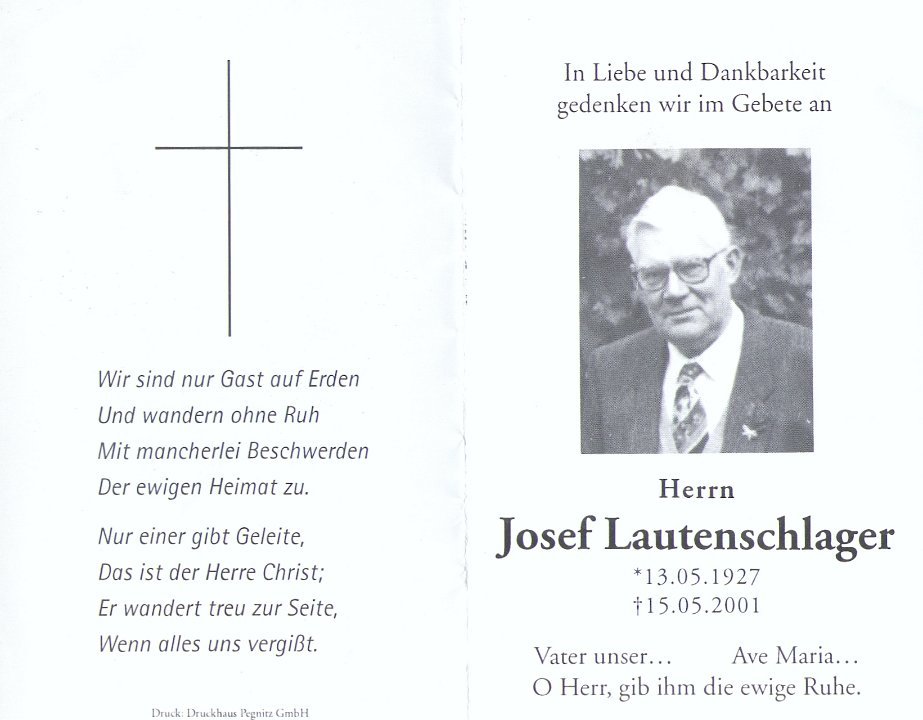 Lautenschlager Josef 13.05.1927-15.05.2001 Lederer Liesl geb Neuner 31.07.1913-13.04.1975 Lederer Maria geb. Eckert 02.08.1902 - 12.04.1988 SB Lehner Martin 04.06.1931 - 11.08.2024 Z