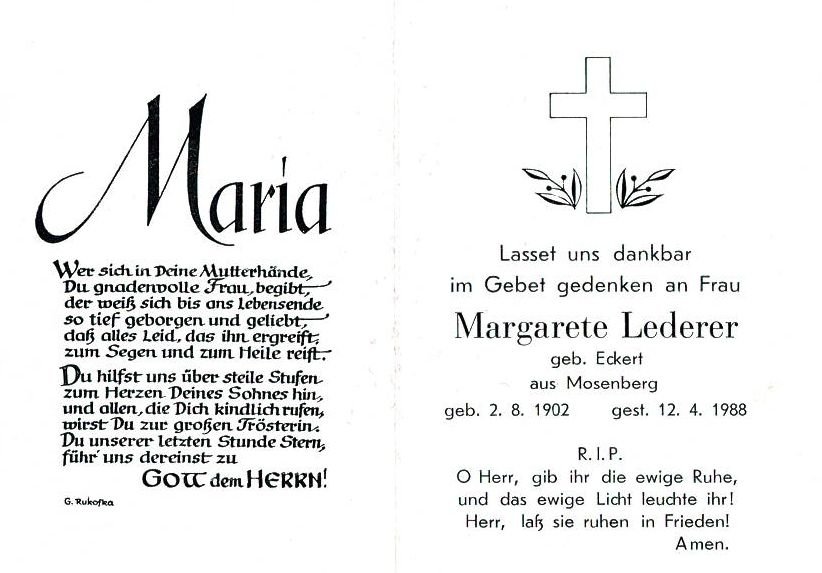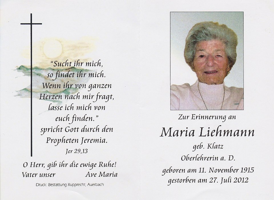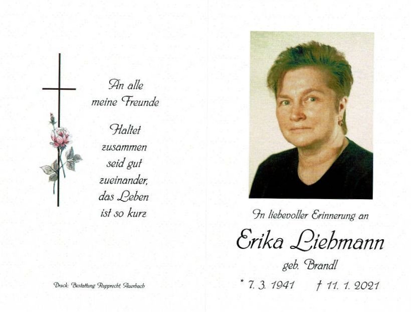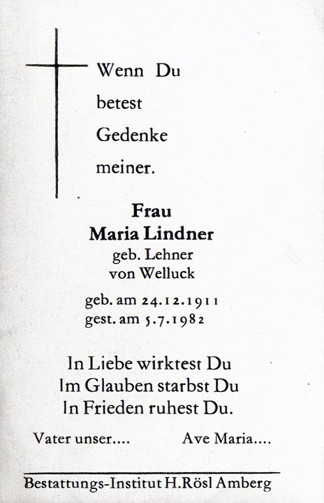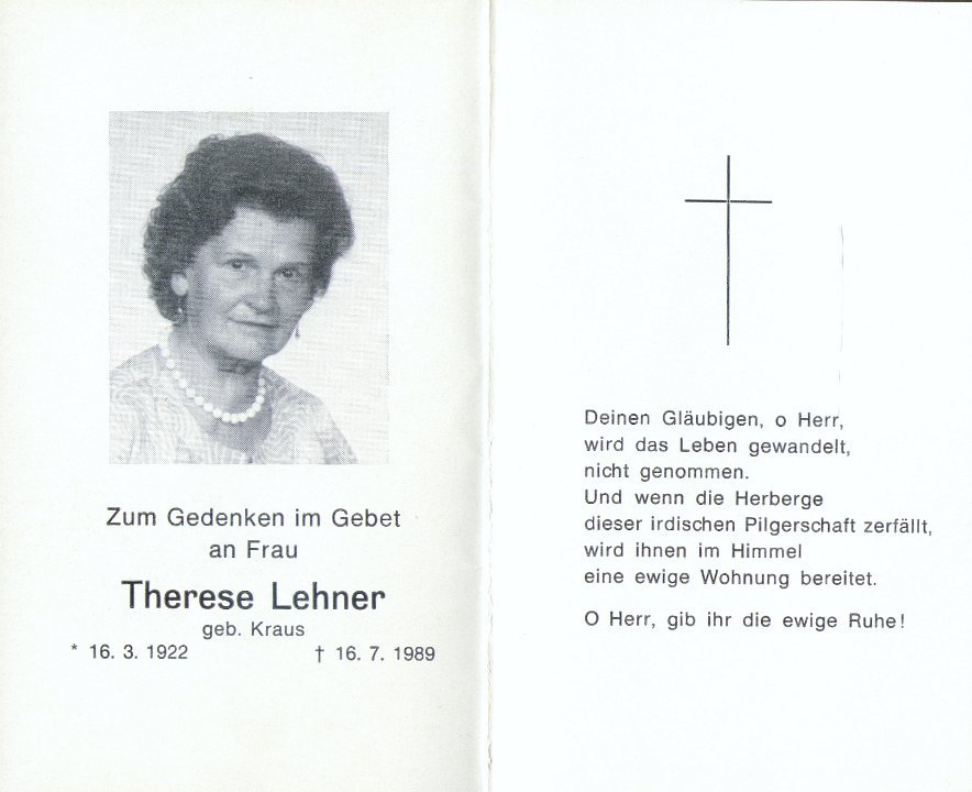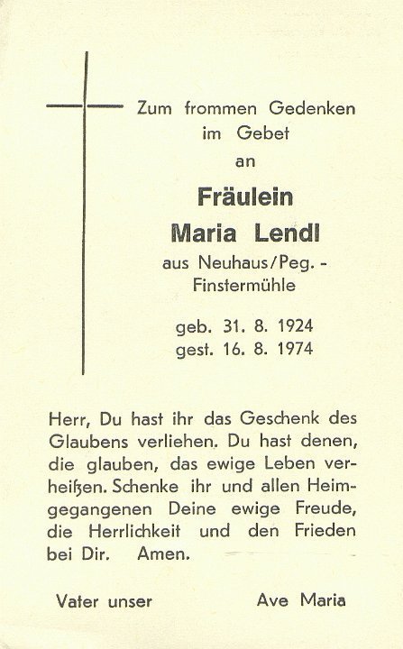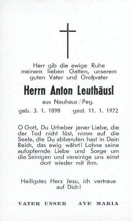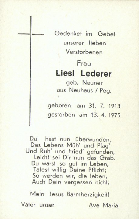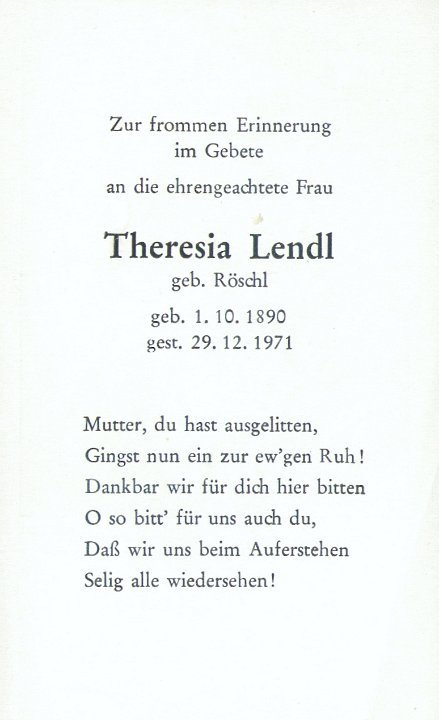 Lendl Theresia geb Roeschl 01.10.1890-29.12.1971 Leuthäusl Anton 03.01.1898-11.01.1972 Liehmann Erika geb Brandl 07.03.1941 - 11.01.2021 Liehmann Maria geb. Klatz 11.11.1915-27.07.2012