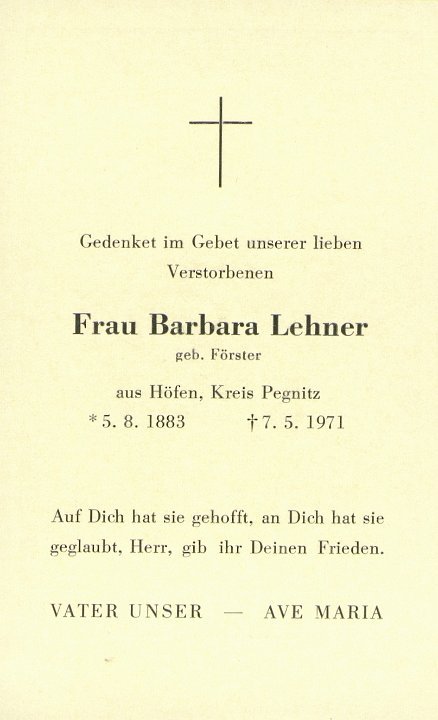 Lehner Barbara geb Foerster 05.08.1883-07.05.1971 Lehner Georg 15.08.1906 - 26.07.1990 SB Lehner Therese geb Kraus 16.03.1922-16.07.1989 Leissner Hans 13.02.1928-15.12.2008