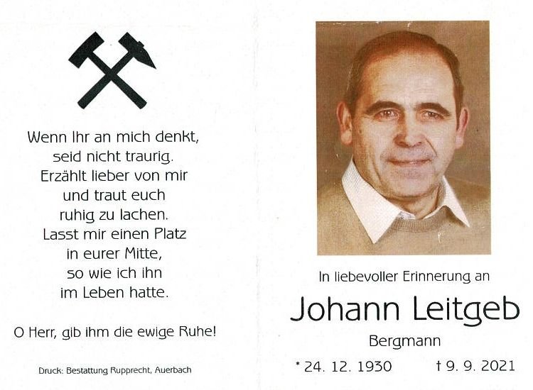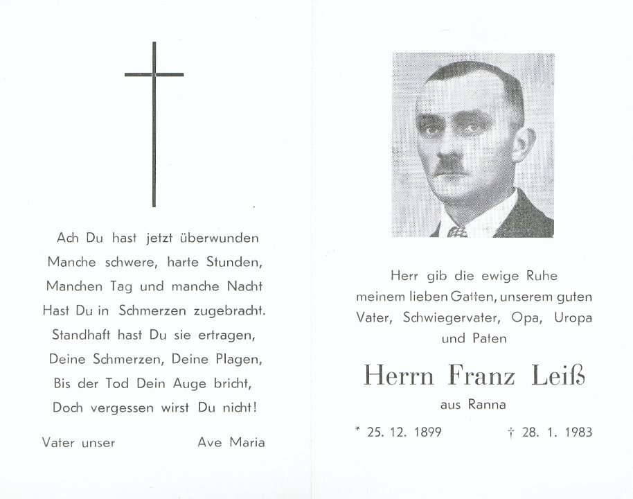Leissner Hedwig geb Regn 05.10.1927-12.11.2003 Leissner Herbert 08.01.1962-05.09.2012 Leiss Franz 25.12.1899-28.01.1983 Leitgeb Johann 24.12.1930-09.09.2021