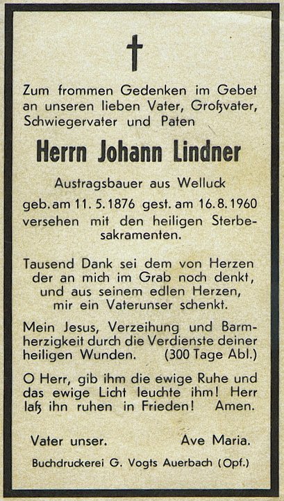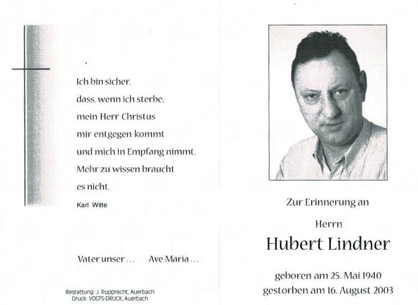 Lindner Margarete geb. Schaeffner 01.09.1948 - 13.02.2001 SB Lindner Hubert 25.05.1940 - 16.08.2003 SB Lindner Johann 11.05.1876-16.08.1960 Lindner Josef 17.03.1917-29.08.1955