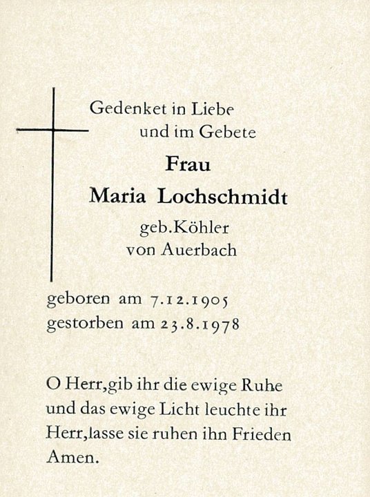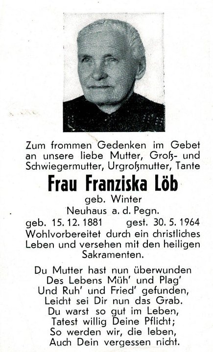 Lobenhofer Heinrich 29.05.1906-05.01.1969 Lochschmidt Franz 20.02.1902-04.09.1967 Lochschmidt Maria geb. Köhler 07.12.1905-23.08.1978 SB Loeb Franziska geb Winter 15.12.1881 - 30.05.1964