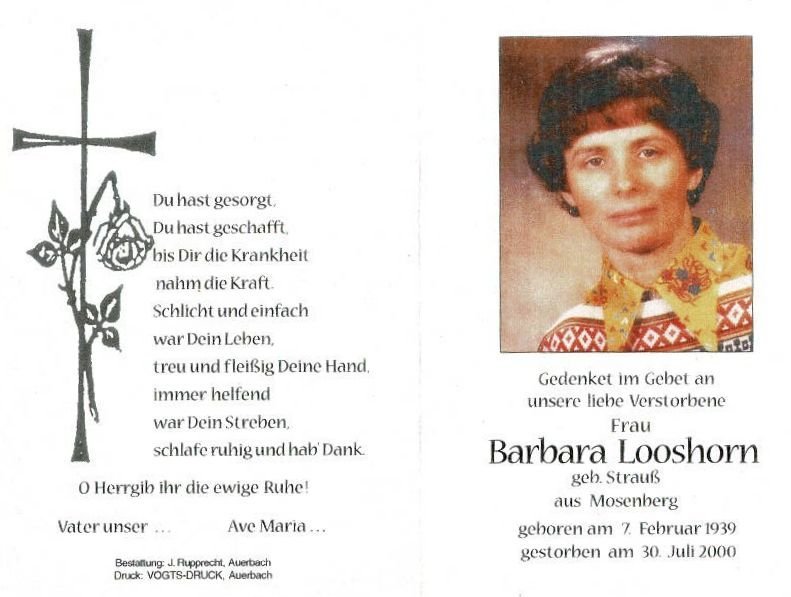 Lohner Joachim 28.03.1962-08.02.2016 Lohner Josef 01.02.1913-26.07.1969 Looshorn Barbara geb. Strauss 07.02.1939 - 30.07.2000 Loos Fritz 18.11.1944 - 30.07.2008 SB