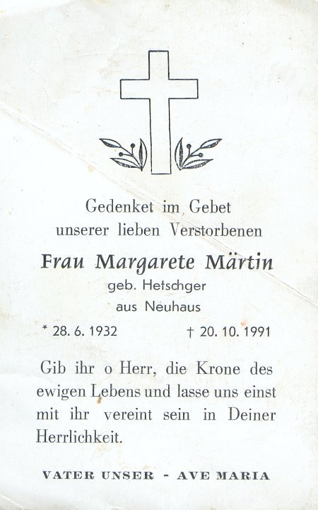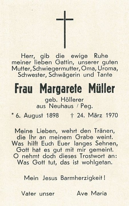 Märtin Margarete geb Hetschger 28.06.1932-20.10.1991 Müller Margarete geb Hoellerer 06.08.1898 - 24.03.1970 Neidhart Franziska geb Keil 19.05.1881 - 24.01.1969 Nelson Oehme 06.05.1961 - 30.07.2012