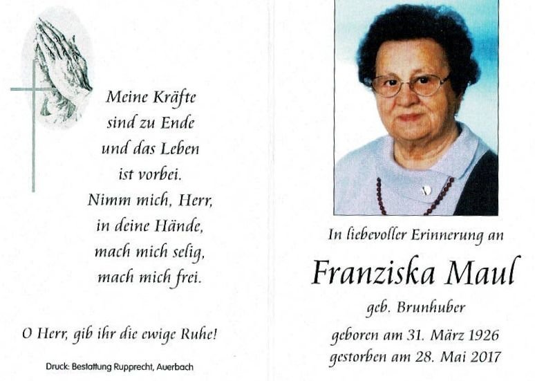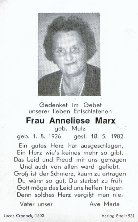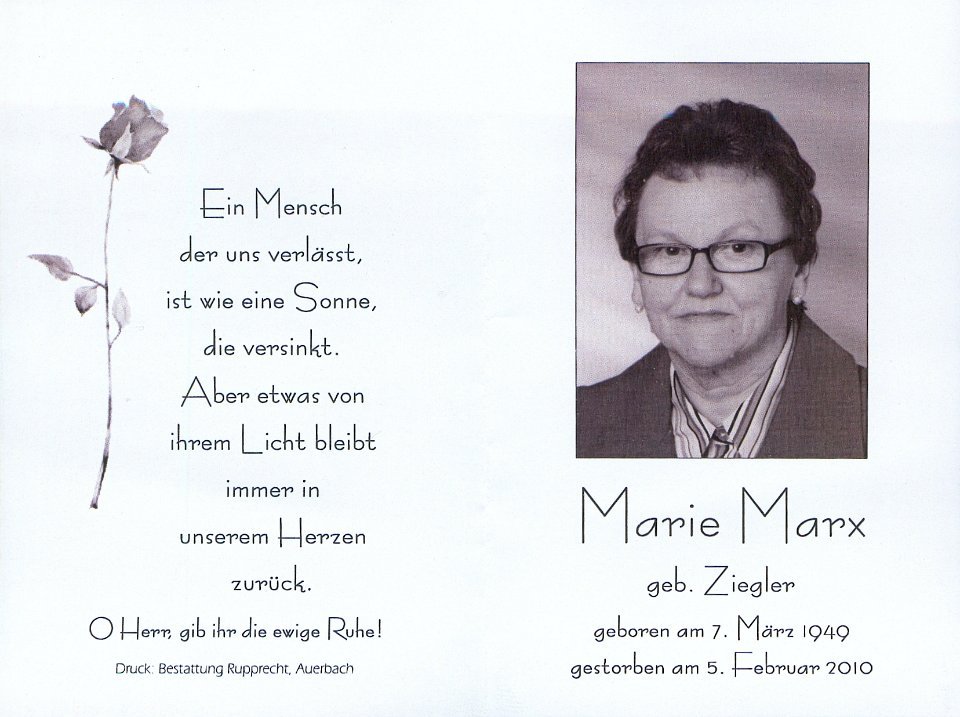 Marx Anneliese geb. Mutz 01.08.1926-18.05.1982 Marx Marie Ziegler 07.03.1949-05.02.2010 Marx Werner 27.04.1924-20.03.1970 Maul Franzika geb. Brunhuber 31.03.1926 - 28.05.2017