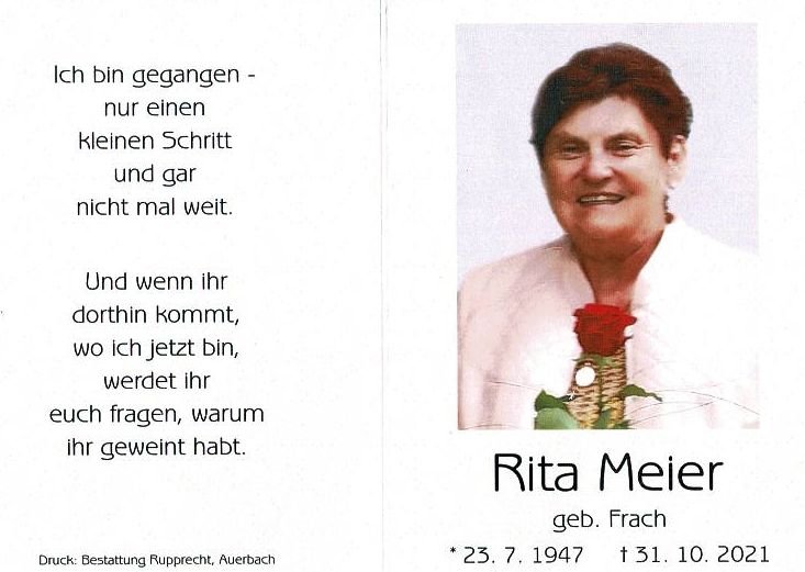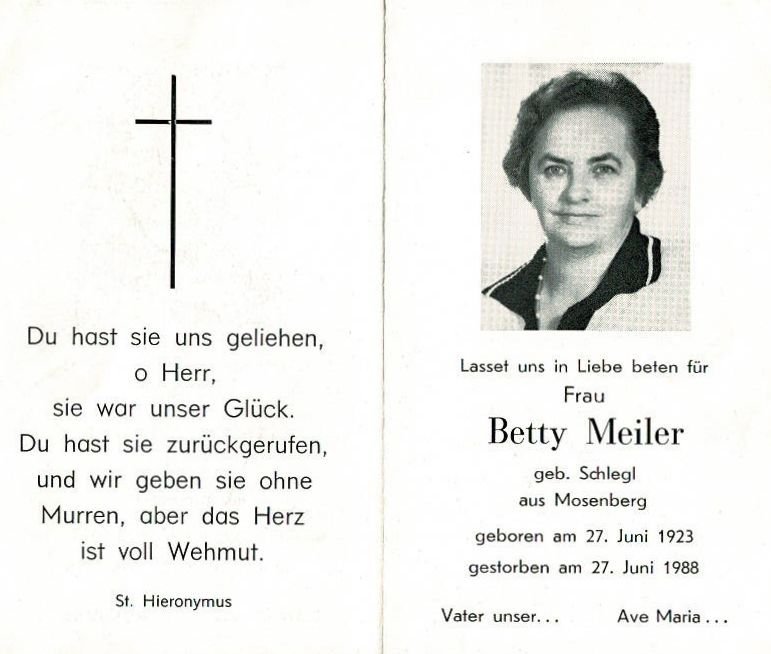 Meier Rita geb Frach 23.07.1947-31.10.2021 Meiler Betty geb. Schlegl 27.06.1923 - 27.06.1988 Meiler Georg 18.04.1913 - 28.04.1993 Meiler Barbara geb Ziegler 25.03.1909-23.02-1998