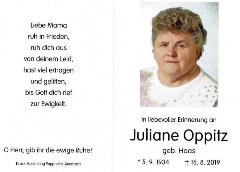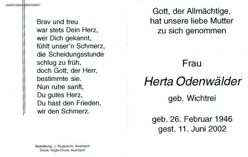 Odenwälder Herta geb. Wichtrei 26.02.1946 - 11.06.2002 Oppitz Juliane geb. Haas 05.09.1934 - 16.08.2019 Ott Helmut 17.08.1944-30.12.2010 Papsch Albine geb. Klein 03.10.1897 - 27.12.1981 SB