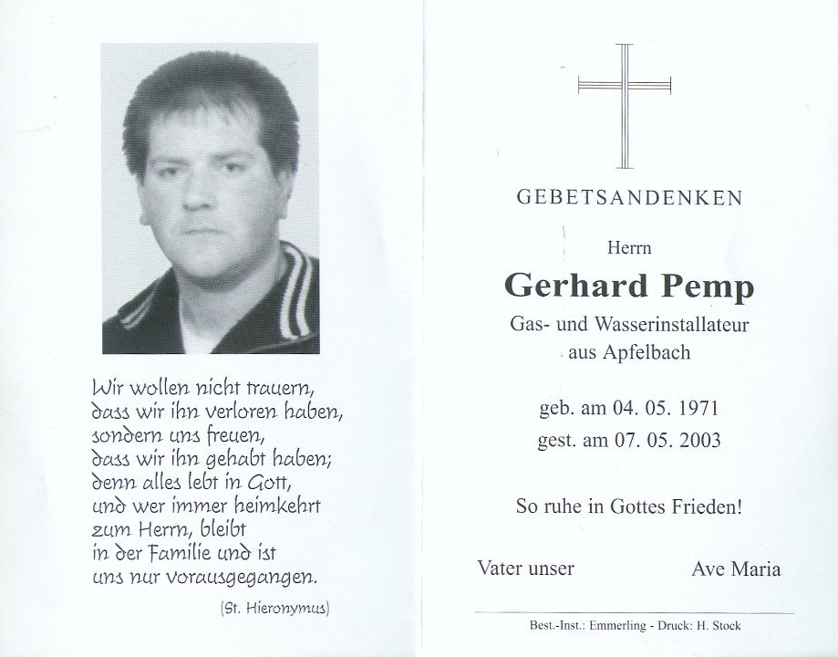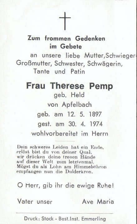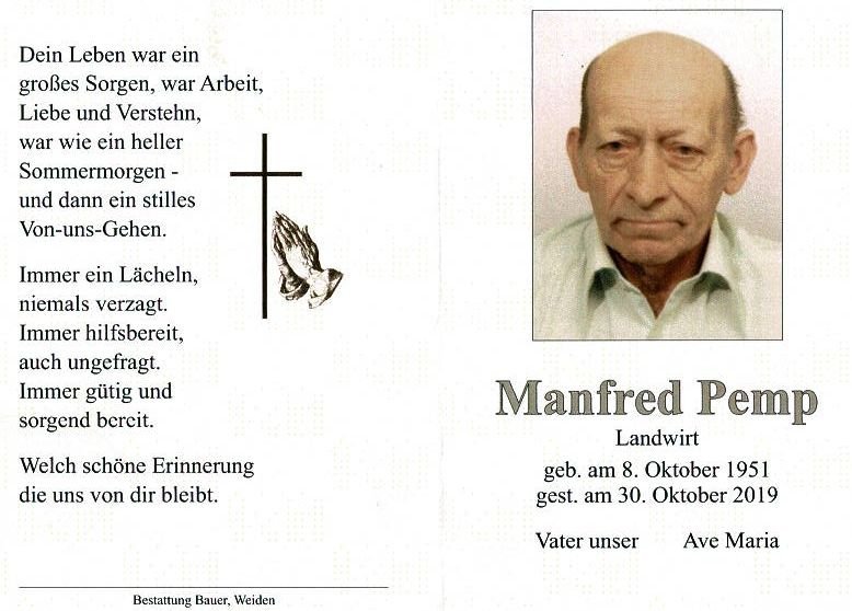 Pemp Josefine geb. Hofmann 07.07.1929 - 27.08.1989 Pemp Manfred 08.10.1951 - 30.10.2019 Pemp Gerhard 04.05.1971-07.05.2003 Pemp Therese geb Held 12.05.1897-30.04.1974