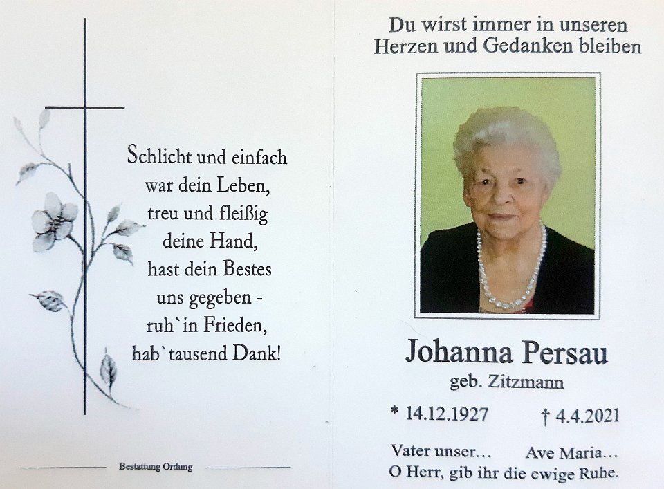 Persau Ewald 28.08.1964-03.02.2022 Persau Johanna geb Zitzmann 14.12.1927 - 04.04.2021 SB Pfeffer Friedrich 10.08.1889-16.07.1972 Pfeffer Georg 22.06.1925-19.02.1982