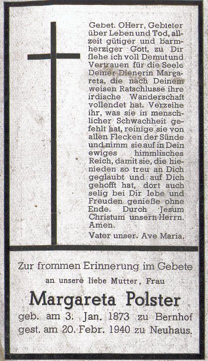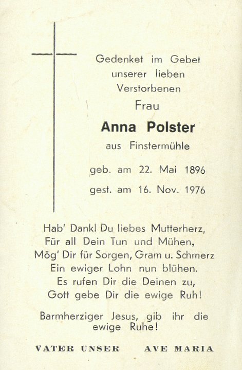 Pieper Gunda geb. Iberl 19.06.1922-27.08.2015 Plesse Clara geb Barg 05.01.1920-13.08.2007 Polster Anna 22.05.1896-16.11.1976 Polster Margareta 03.01.1873-2002.1940