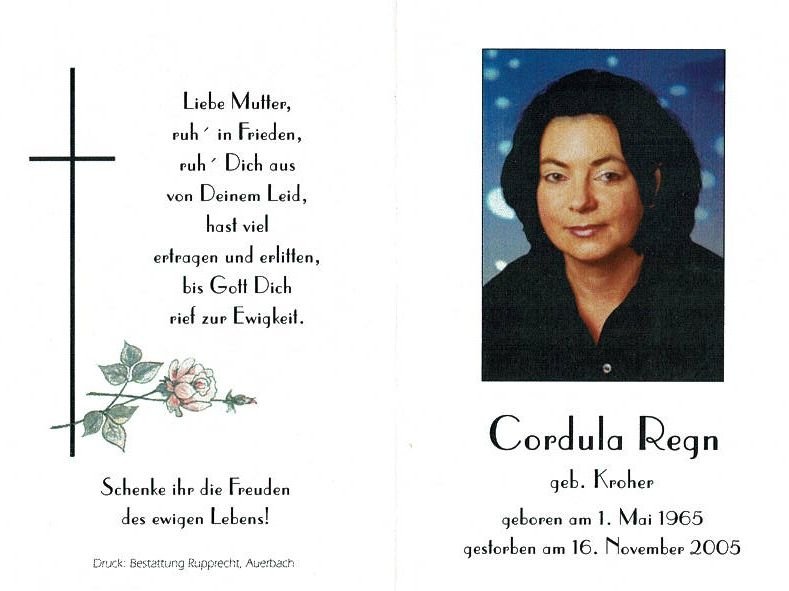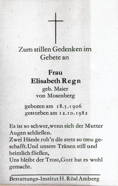 Regn Anna geb Kredler 15.07.1906-21.01.1962 Regn Cordula geb. Kroher 01.05.1965 - 16.11.2005 SB Regn Elisabeth geb Maier 18.05.1906-12.10.1982 Regn Fanny 26.01.1938-15.12.2002