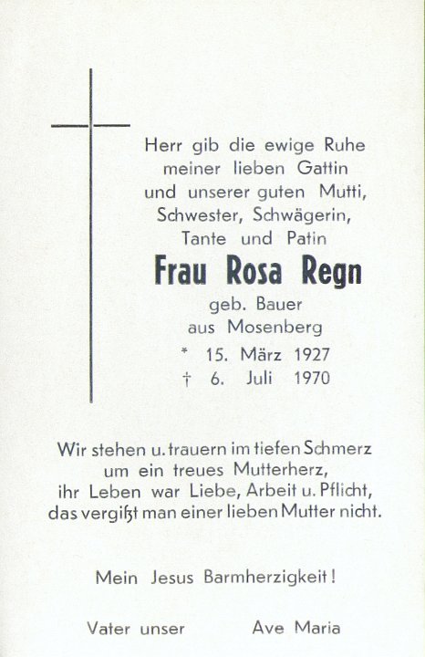 Regn Hans 23.04.1928-20.06.2004 Regn Johann 25.01.1897 - 28.09.1992 SB Regn Rosa geb Bauer 5.03.1927-06.07.1970 Reichel Magdalena geb Wittmann 13.02.1896-12.06.1971
