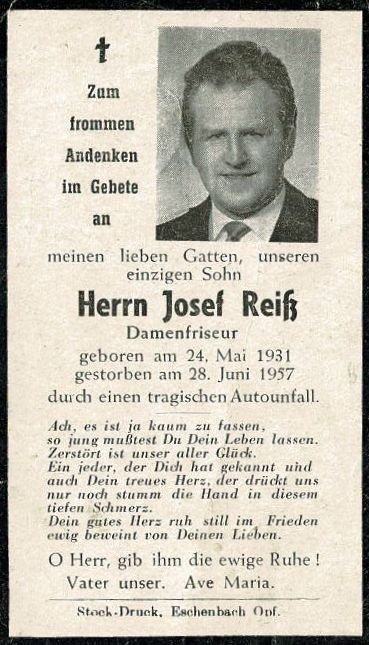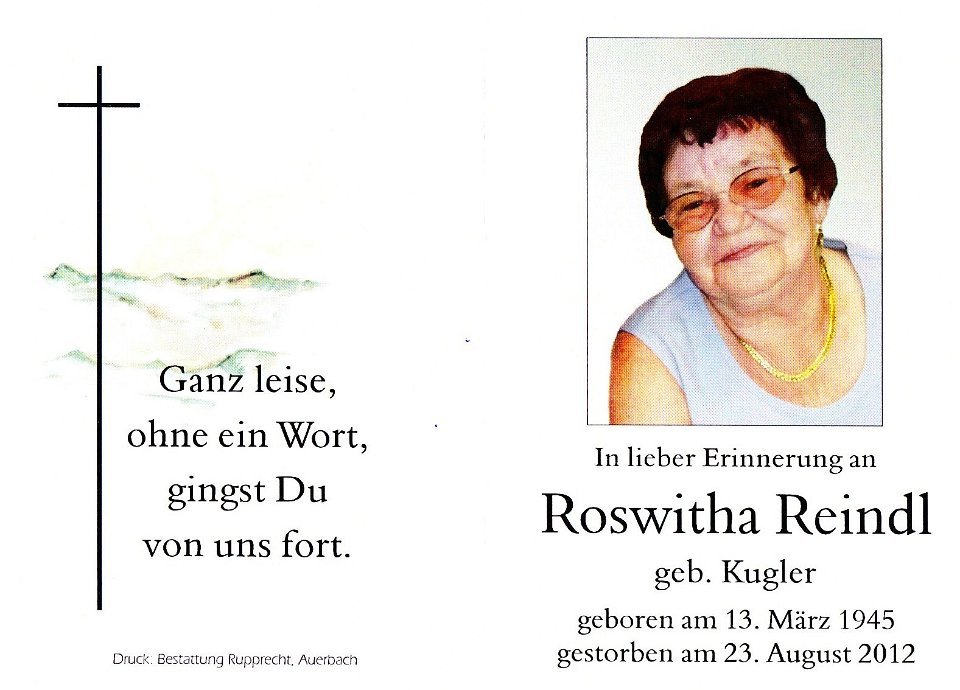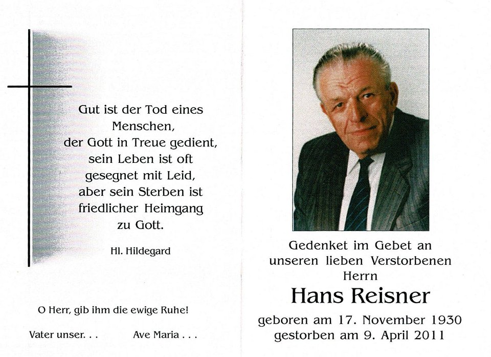 Reindl Roswitha geb. Kugler 13.03.1945-23.08.2012 Reinl Marie geb. Lorenz 01.04.1897 - 21.09.1986 SB Reisner Hans 17.11.1930-09.04.2011 SB Reiss Josef 24.05.1931 - 28.6.1957