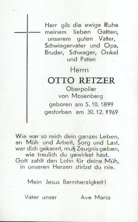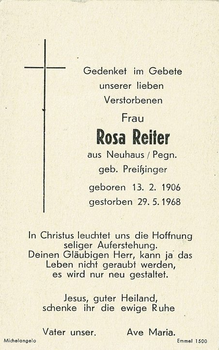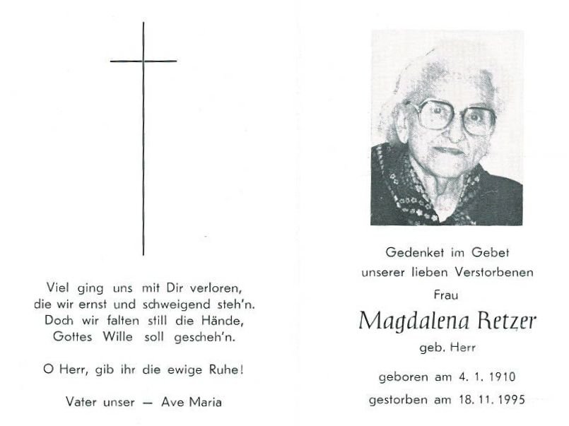 Reiter Rosa geb Preissinger 13.02.1906 - 29.05.1968 Retzer Magdalena geb. Herr 04.01.1910 - 18.11.1995 SB Retzer Otto 05.10.1899-30.12.1969 Ringl Else geb. Eisen - 22.06.1930 - 25.11.2002 SB