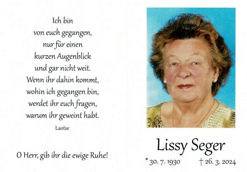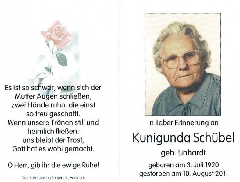 Schübel Kunigunda geb. Linhardt 03.07.1920 - 10.08.2011 SB Seger Elisabeth geb. 30.07.1930 - 26.03.2024 SB Seger Georg 23.04.1901-13.04.1965 Sertl Josef 06.02.1903-28.12.1958