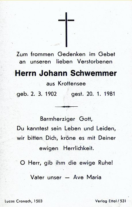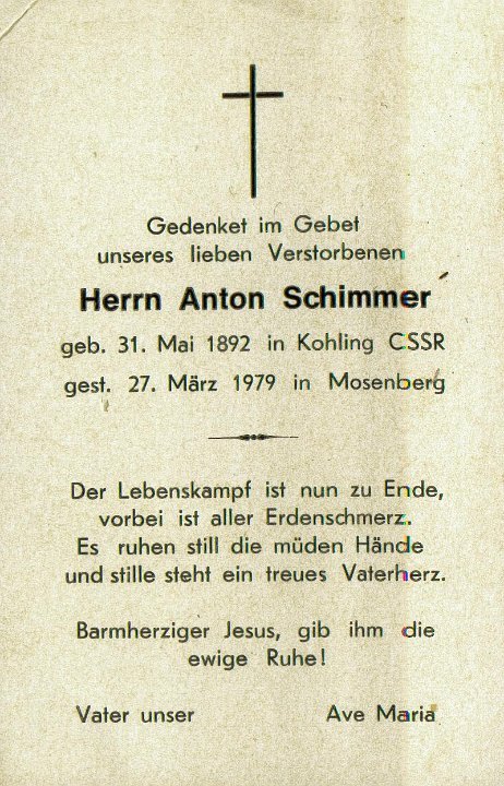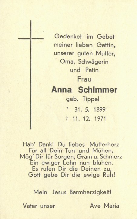 Schickentanz Josef 16.03.1947 - 19.06.2015 Schiesser Adam 20.11.1895-19.06.1974 Schimmer Anna geb Tippel 31.05.1899-11.12.1971 Schimmer Anton 31.05.1892-27.03.1979