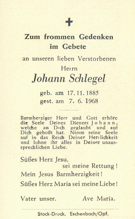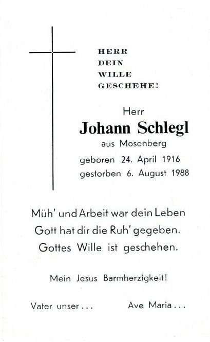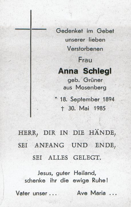 Schlegel Johann 17.11.1885-07.06.1968 Schlegl Johann 24.04.1916 - 06.08.1988 Schlegl Anna geb Gruener 18.09.1894-30.05.1985 Schlegl Elisabeth geb Holzmann 23.06.1920-18.07.2004