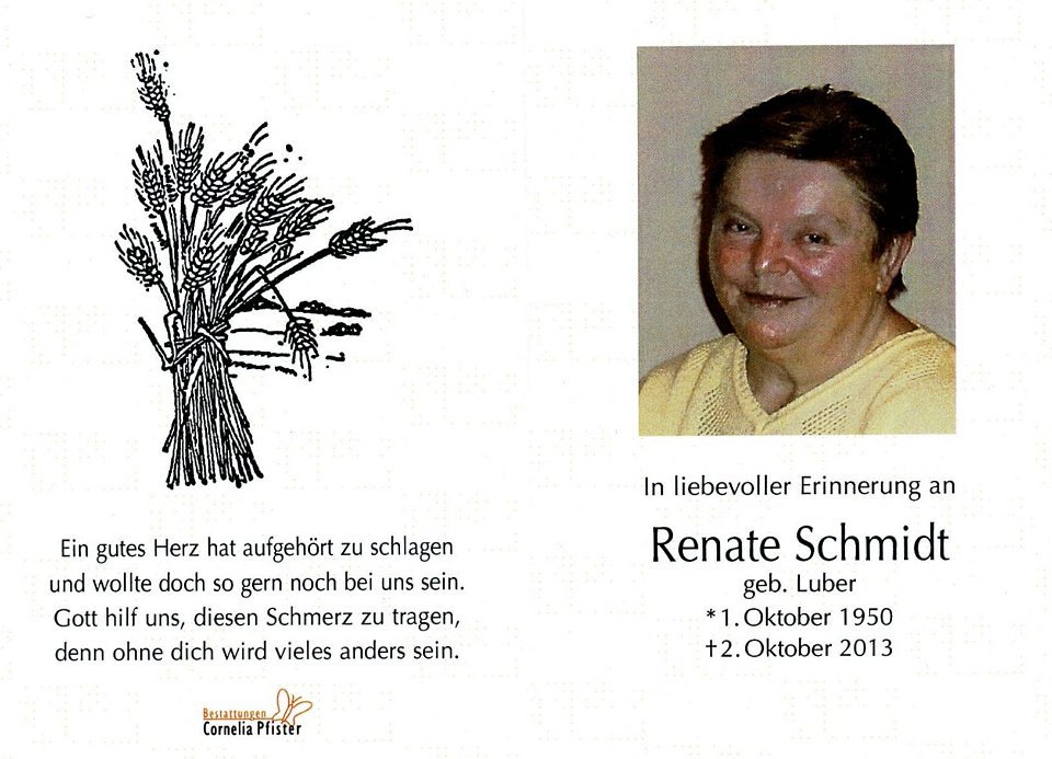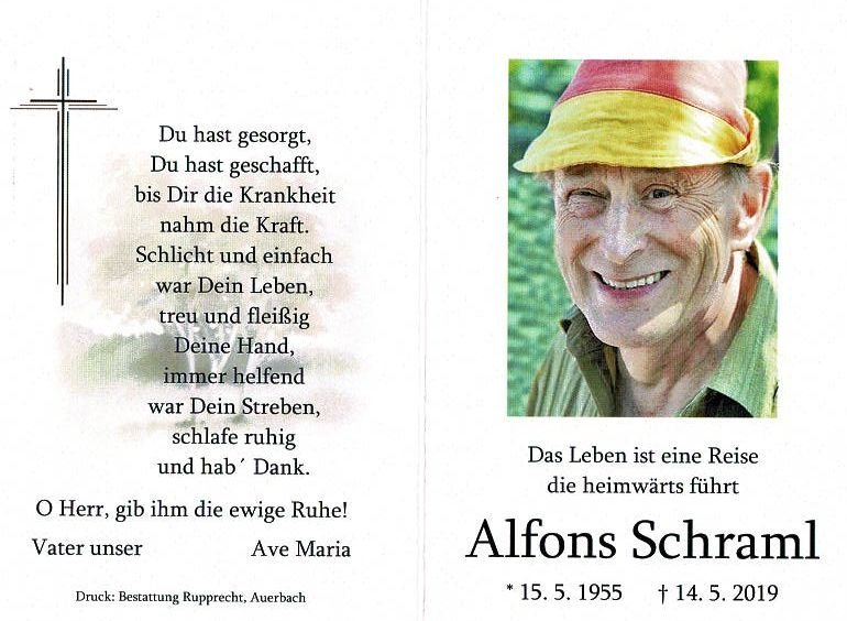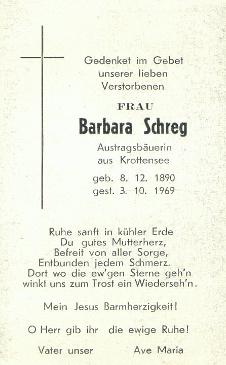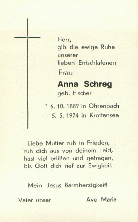 Schmidt Renate geb Luber 01.10.1950 - 02.10.2013 Schraml Alfons 15.05.1955 - 14.05.2019 Schreg Anna geb Fischer 06.10.1889-05.05.1974 Schreg Barbara 08.12.1890-03.10.1969