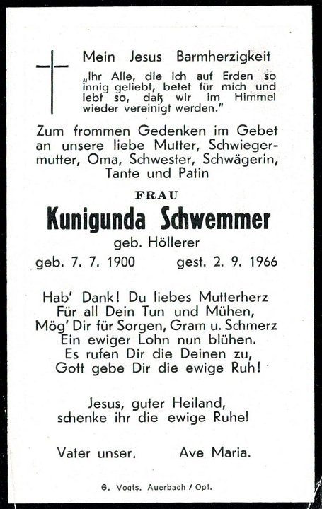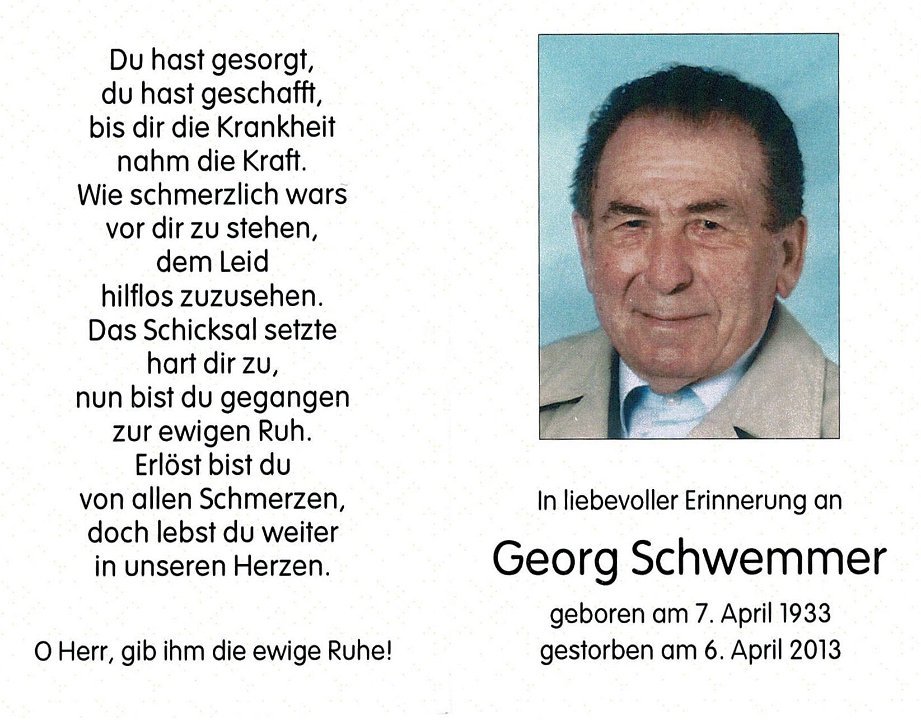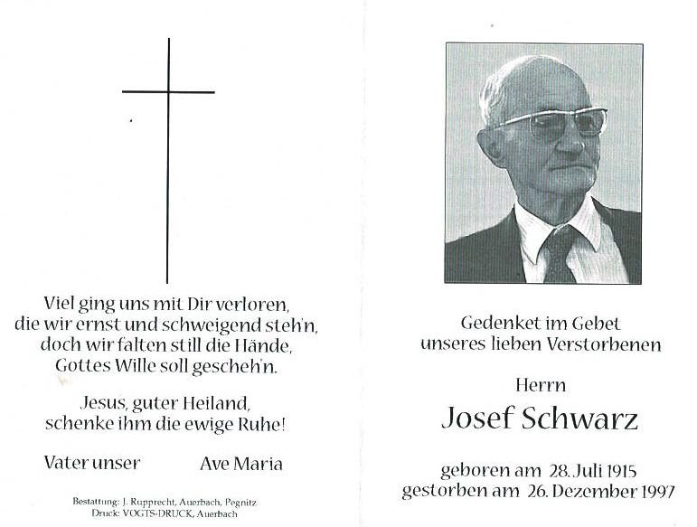 Schwarz Josef 28.07.1915 - 26.12.1997 SB Schwarz Margarete geb. Fretschner 29.11.1920 - 19.12.2013 SB Schwemmer Georg 07.04.1933 - 06.04.2013 Schwemmer Kunigunda geb Hoellerer 07.07.1900 - 02.09.1966