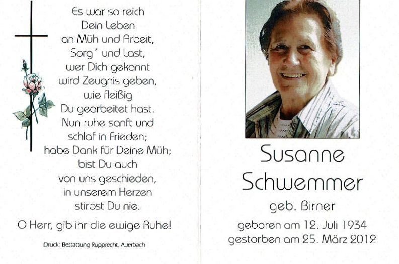 Schwemmer Susanne geb. Birner 12.0.1934 - 25.03.2012 Schwemmer Johann 02.03.1902-20.01.1981 Schäfer Anastasia geb. Kubizkaja 12.11.1933 - 11.07.2024 SB Schätzlein Paula geb Wedel 25.08.1908-27.05.1952