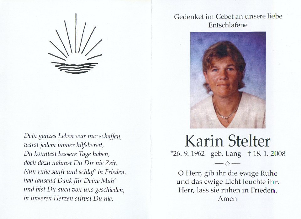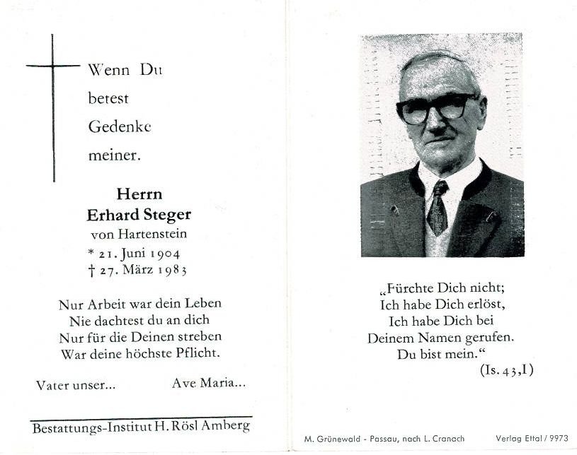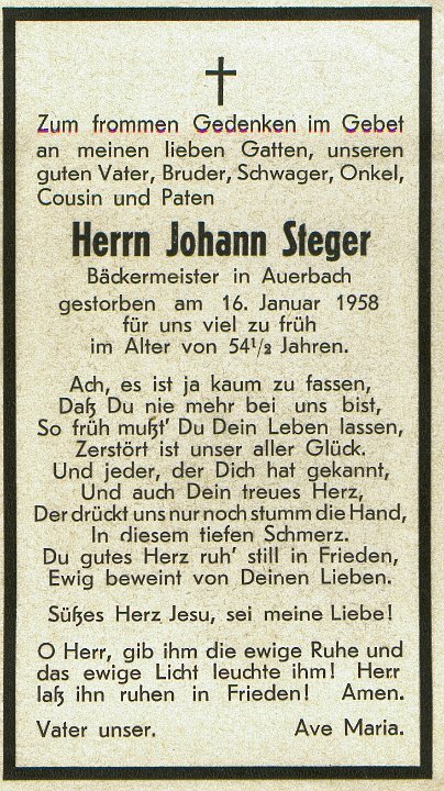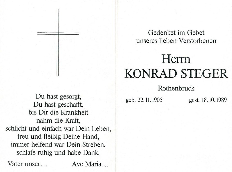 Steger Johann 1904-16.01.1958 Steger Konrad 22.11.1905-18.10.1989 SB Stelter Karin geb Lang 26.09.1962-18.01.2008 Steubl Franz 31.05.1940-11.02.2024