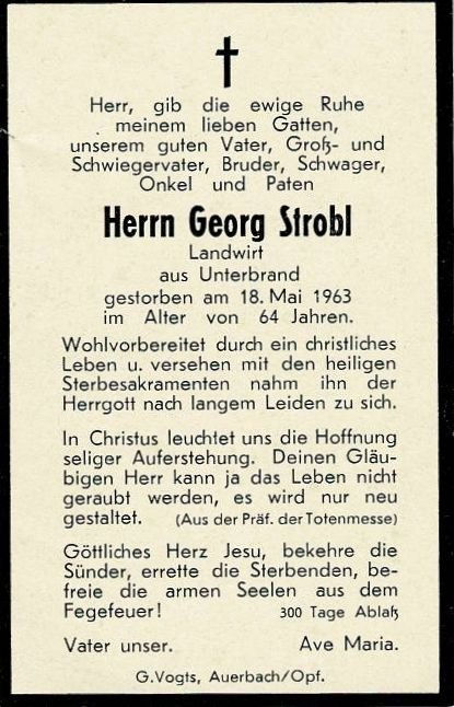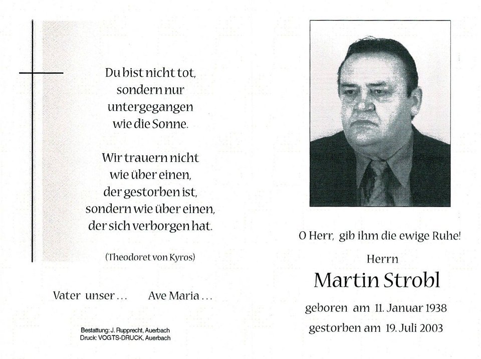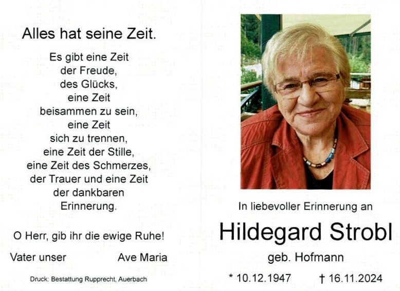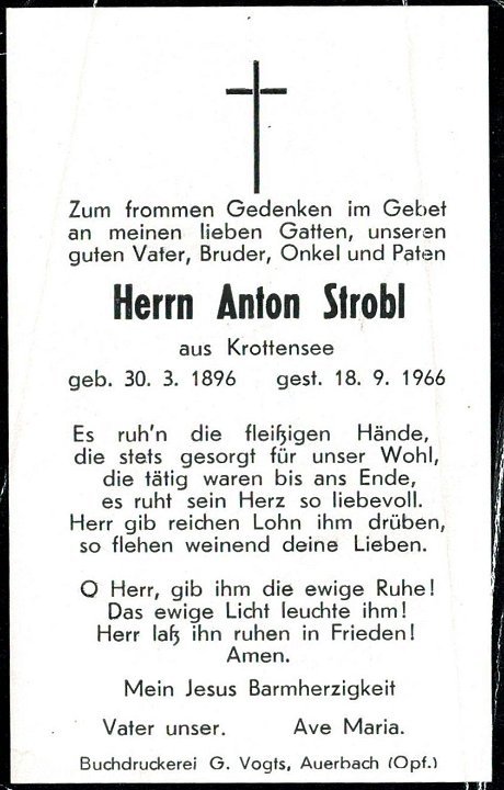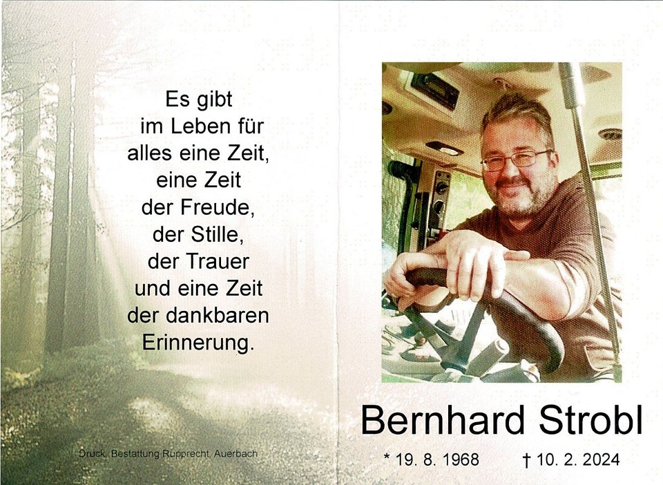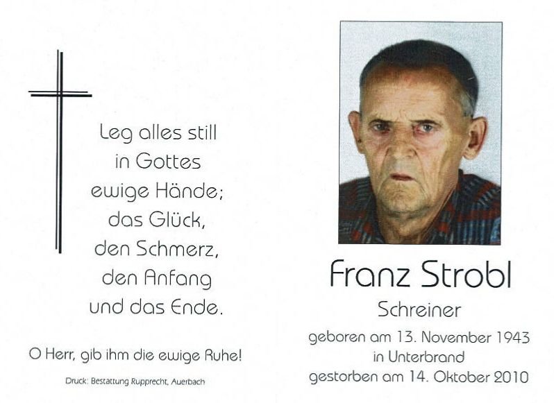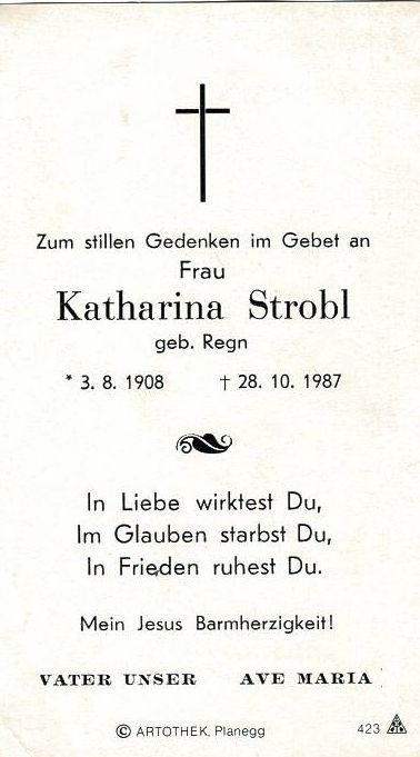 Strobl Katharina geb. Regn 03.08.1908 - 28.10.1987 Strobl Martin 11.01.1938 - 19.07.2003 Strobl Bernhard 19.08.1968-10.02.2024 Strobl Franz 13.11.1943 - 14.10.2010 SB