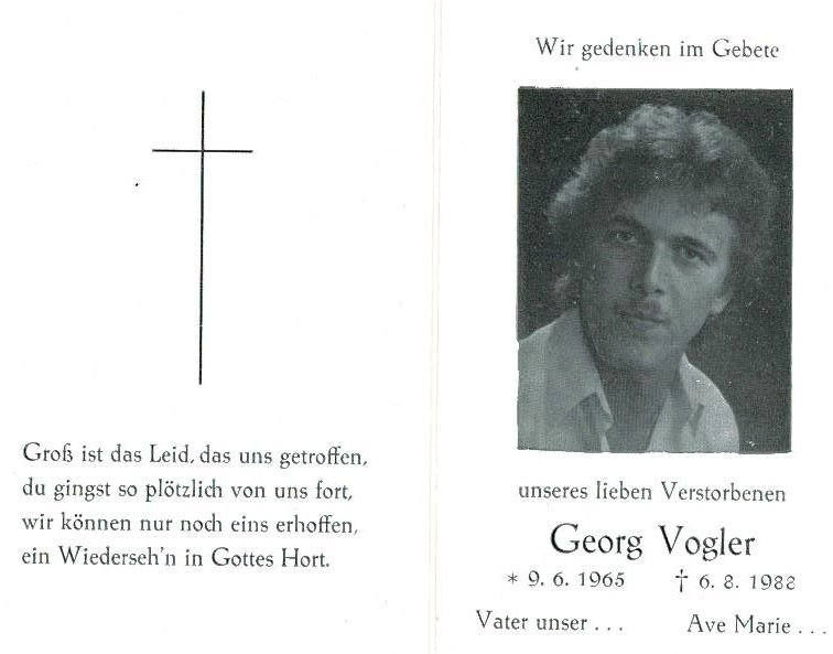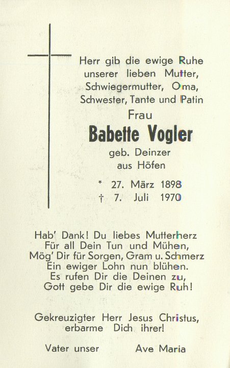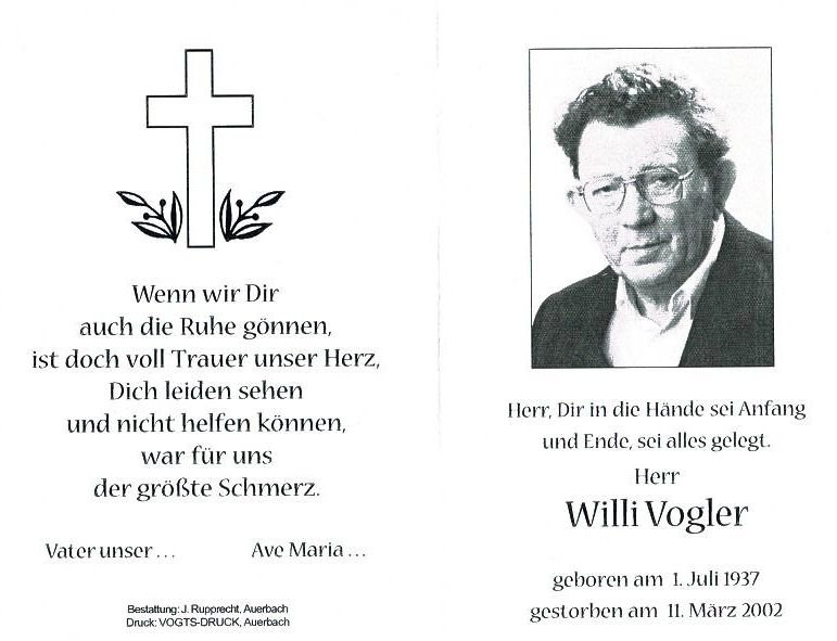 Vogler Babette-geb Deinzer 27.03.1898-07.07.1970 Vogler Georg 09.06.1965 - 06.08.1988 SB Vogler Georg 17.05.1939 - 25.04.1982 SB Vogler Willi 01.07.1937 - 11.03.2002 SB