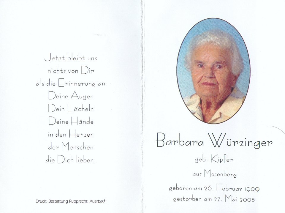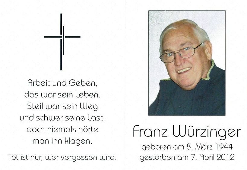 Wollner Michael 07.08.1901-06.02.1973 Wünsch Marie 25.02.1898 - 11.10.1977 Würzinger Barbara geb Kipfer 26.02.1909-27.05.2005 Würzinger Franz 08.03.1944 - 07.04.2012 SB