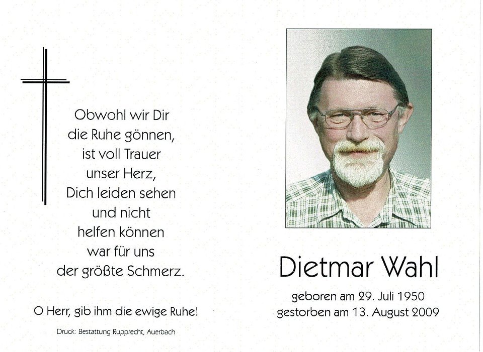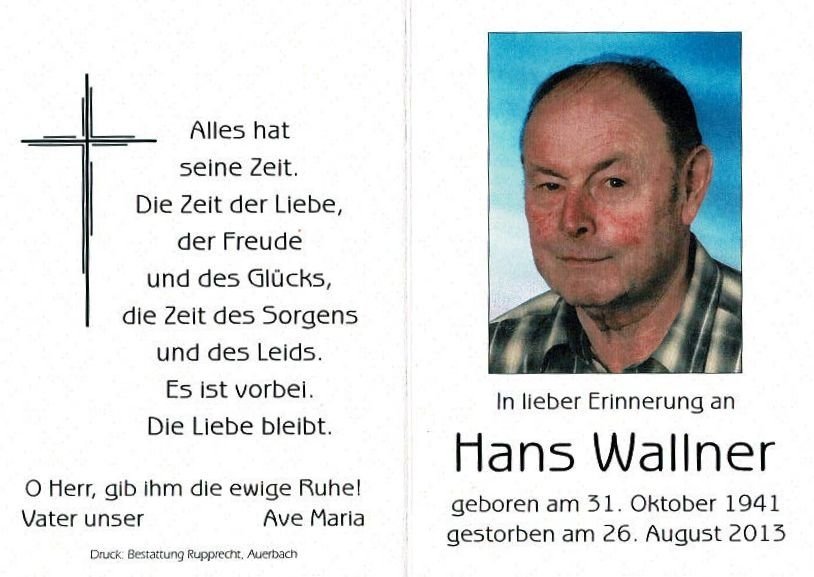 Wahl Dietmar 29.07.1950 - 13.08.2009 Waldmann Amalie geb. Ratzer 29.08.1908 - 31.08.1987 SB Wallner Hans 31.10.1941 - 26.08.2013 Walter Willi 09.06.1962 - 29.11.2016