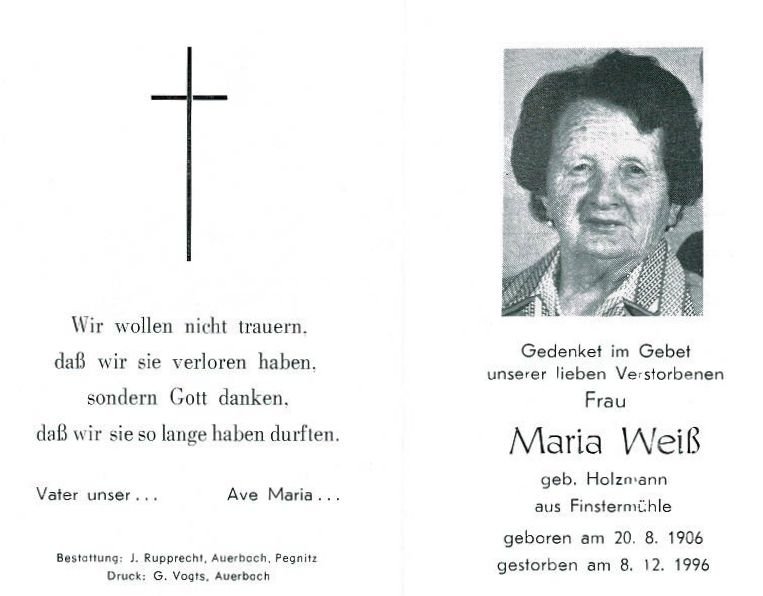 Weißenberger Maria geb. Regn 10.11.1940-24.03.2024 SB Weiss Eva geb Kurz 21.02.1876-03.03.1969 Weiß Maria geb. Holzmann 20.08.1906 - 08.12.1996 SB Weiß Nikolaus - 22.10.1906 - 01.01.1985 SB