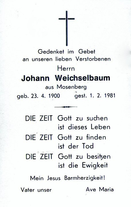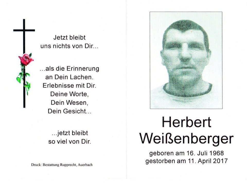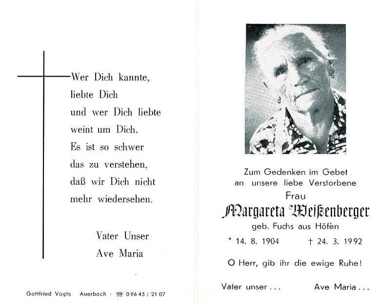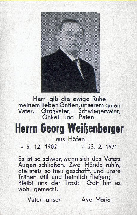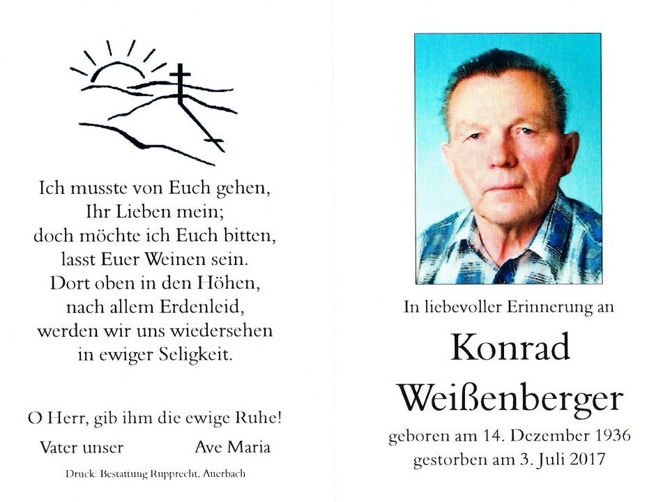 Weißenberger Georg 05.12.1902-23.02.1971 Weißenberger Herbert 16.07.1968-11.04.2017 Weißenberger Konrad 14.12.1936-03.07.2017 Weißenberger Margareta geb. Fuchs 14.08.1904 - 24.03.1992 SB