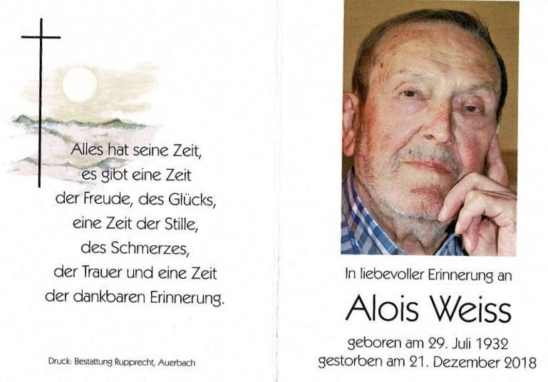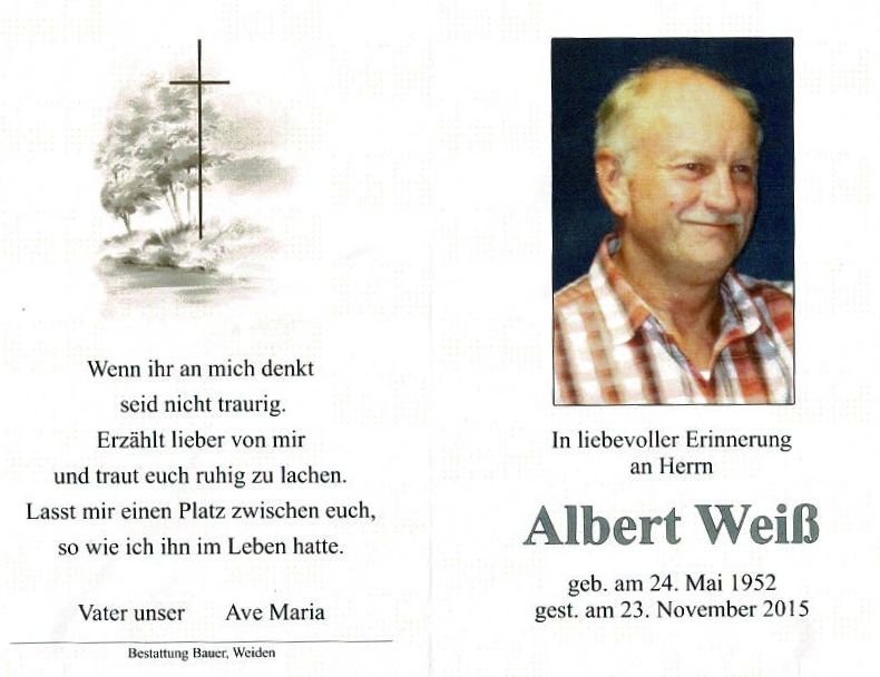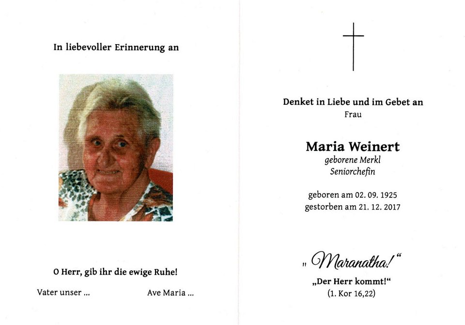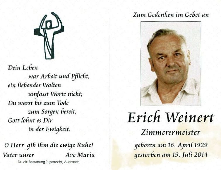 Weinert Erich 16.04.1929 - 19.07.2014 Weinert Maria geb. Merkl 02.09.1925-21.12.2017 SB Weiss Albert 24.05.1952 - 23.11.2015 Weiss Alois 29.07.1932 - 21.12.2018