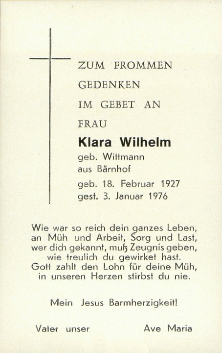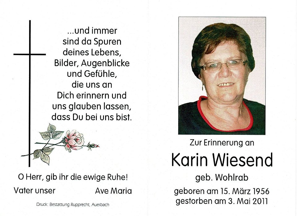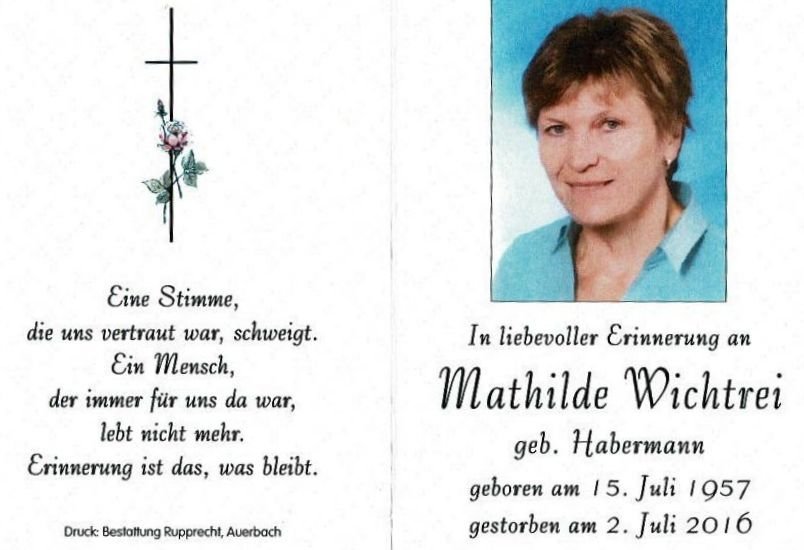 Wichtrei Mathilde geb. Habermann 15.07.1957 - 02.07.2016 Wichtrei Herta 24.12.1924-09.03.1977 Wiesend Karin geb. Wohlrab 15.03.1956-03.05.2011 SB Wilhelm Klara geb Wittmann 18.02.1927-03.01.1976
