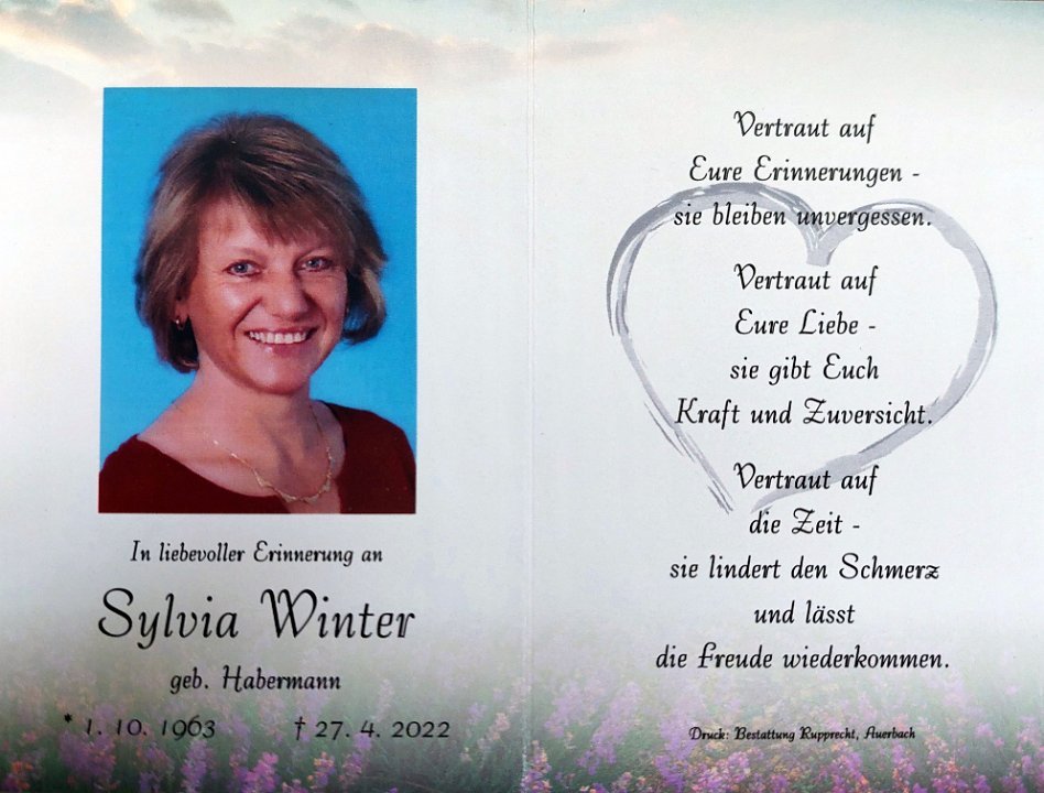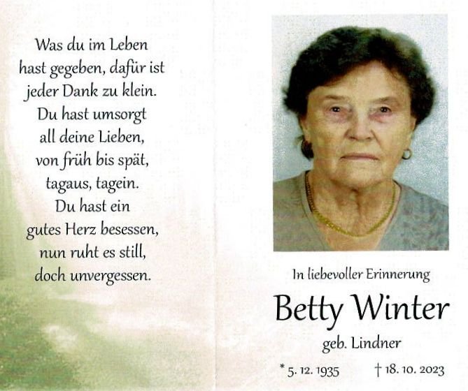 Winter Sylvia geb Habermann 01.10.1963 - 27.04.2022 Winter Ulrich 18.11.1914 - 11.12.1993 SB Winter Barbara 21.06.1885-24.12.1965  Meine Großtante Winter Betty geb. Lindner 05.12.1935 - 18.10.2023