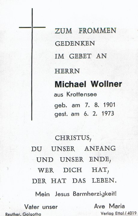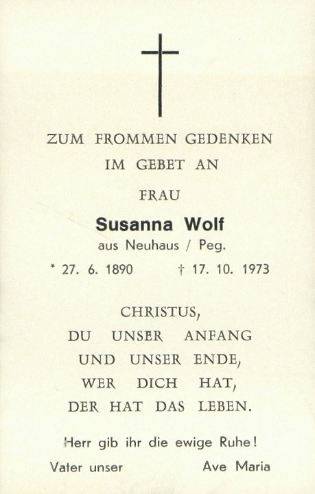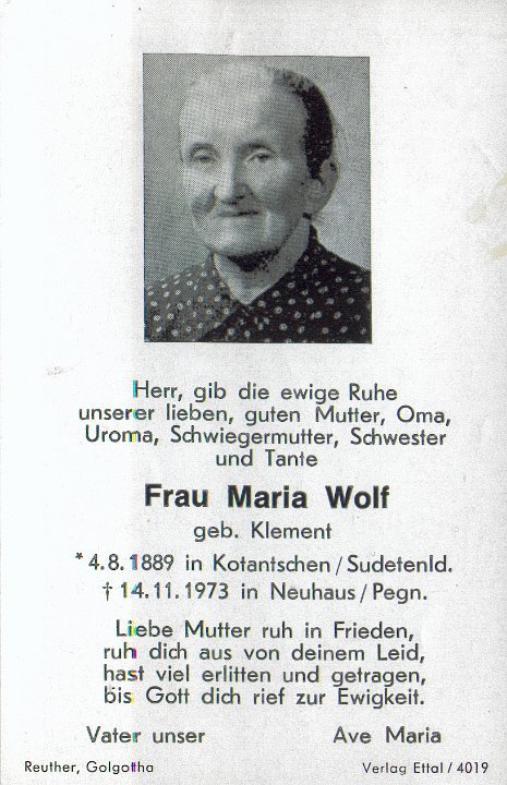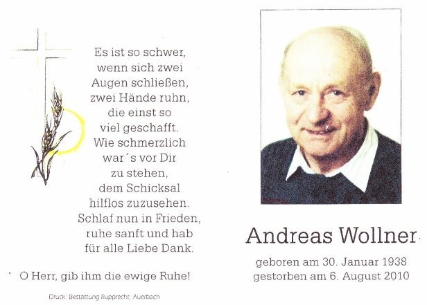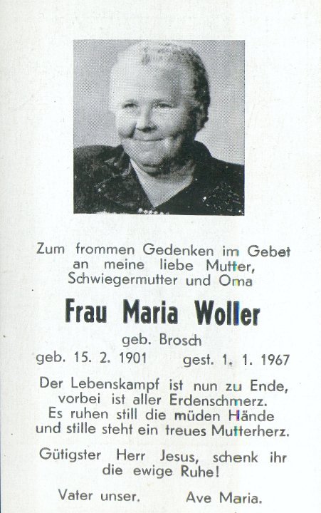 Wolf Maria geb Klement 04.08.1889-14.11.1973 Wolf Susanna 27.06.1890-17.10.1973 Woller Maria geb Brosch 15.02.1901-01.01.1967 Wollner Andreas 30.01.1938 - 6.8.2010